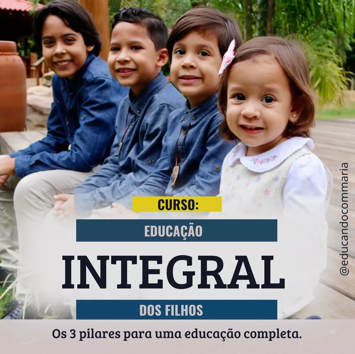 Com o curso Educação Integral dos Filhos do Educando com Maria, tenha acesso a 6 VÍDEOS breves e práticos, incluindo um MÓDULO EXTRA sobre os frutos que colheremos com a educação completa, um SUPER BÔNUS (nossa masterclass "Bendita Rotina") e um PERFIL EXCLUSIVO com lives tira-dúvidas, ambiente de interação, partilhas, momentos de oração em família, lives exclusivas e ajuda mútua.